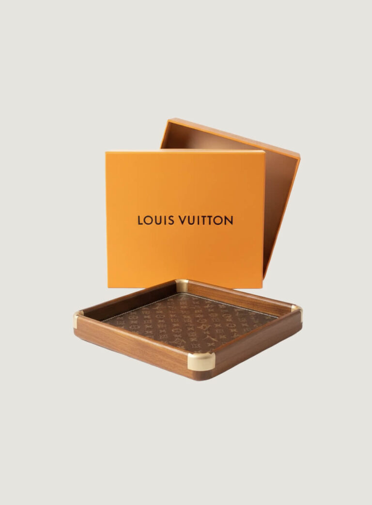 The Louis Vuitton LV Small Square Tray combines clean lines with the brand’s signature luxury aesthetic. Its compact square design brings sophistication to serving, décor, and everyday tabletop organization.
