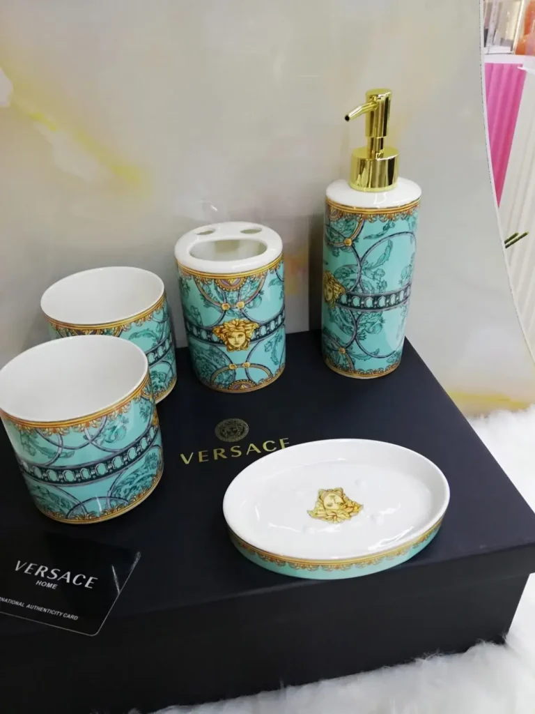 The Versace Bathroom Set of 5 brings luxury and refinement to daily routines. Featuring iconic Versace motifs and high-quality craftsmanship, this set transforms ordinary bathroom essentials into a statement of style and sophistication.